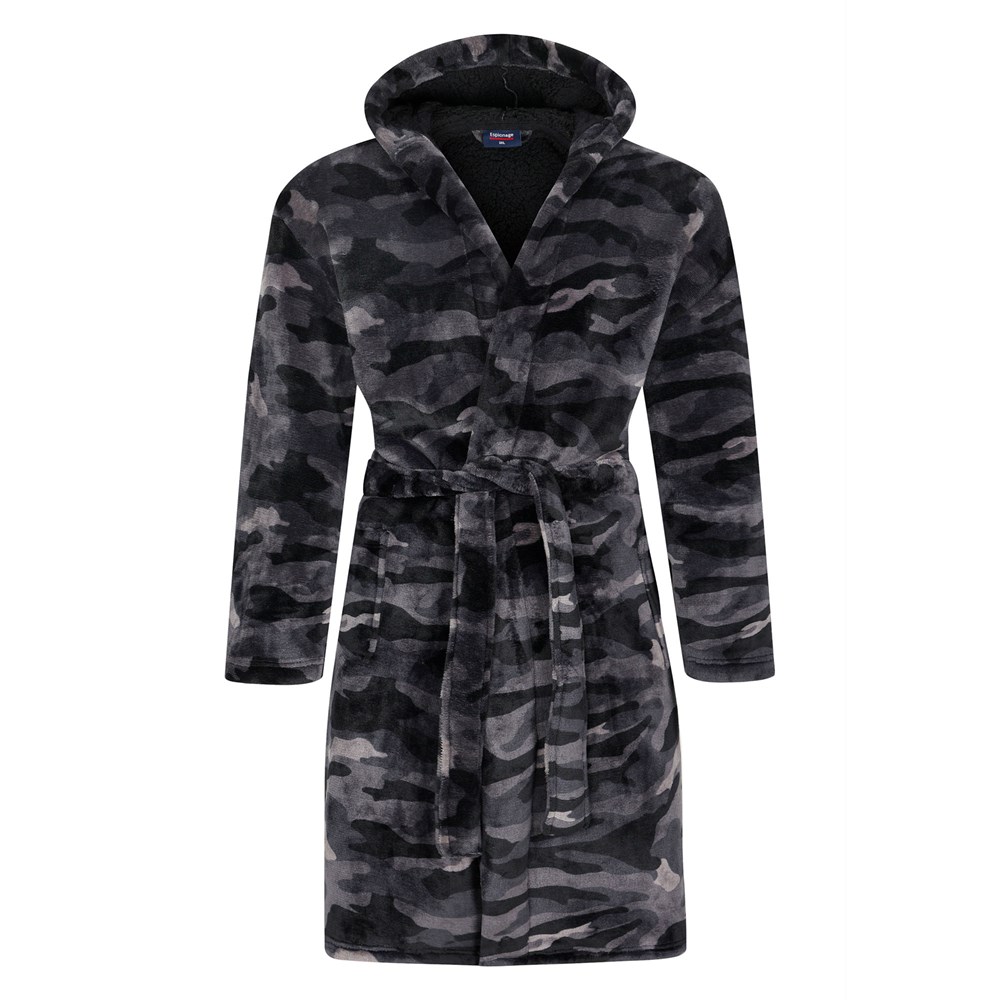 Forkæl dig selv med denne superbløde fleece morgenkåbe i stilrent camouflage-look. Morgenkåben har varmt fór, praktisk hætte, to rummelige sidelommer og bindesnor i taljen, så du kan justere pasformen. Perfekt til hyggelige morgener derhjemme eller efter badet.