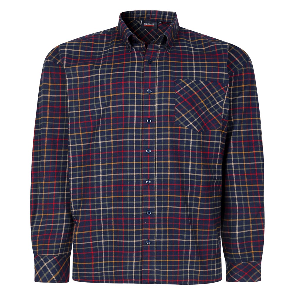 Flot og tidløs skjorte i mørkeblå bundfarve med tern i røde, grønne, beige og mørk gule nuancer – perfekt til både hverdagsbrug og afslappede lejligheder. Skjorten har button-down krave, brystlomme med skråt mønster og en rummelig pasform, der giver maksimal komfort.