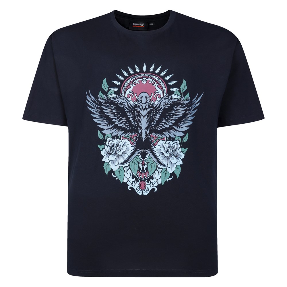Flot mørkeblå T-shirt fra Espionage med et markant grafisk motiv af en ørn omgivet af blomster og ornamenter på brystet. Designet giver et cool og iøjnefaldende udtryk med masser af personlighed. T-shirten er lavet i 100% bomuld, som føles blød og behagelig mod huden – perfekt til både hverdag og fritid.